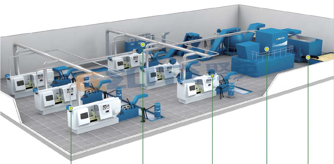 多工位集中油霧凈化治理適用于機床數量規(guī)模較大,或者多臺、多種類型開放式機床,通過吸氣罩或吸氣臂形式收集油霧氣體,并且有條件設置排氣筒的情況,前端收集油霧氣體,通過管道集中輸送到凈化主機中過濾凈化后,通過風機和煙囪潔凈空氣排入大氣