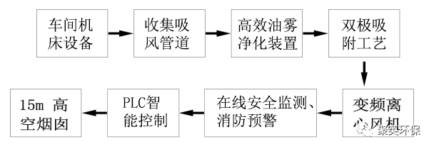 收集系統(tǒng) →高效油霧凈化裝置 → 雙極吸附工藝 → 風(fēng)機(jī)→在線安全監(jiān)測(cè)、消防預(yù)警 →PLC智能控制→ 煙囪(室外寶塔煙囪)