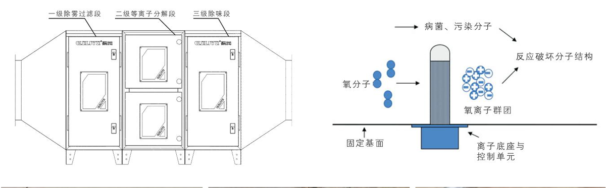 低溫等離子體”是電子、化學(xué)、催化等綜合作用下的電化學(xué)過(guò)程,是依靠等離子體在瞬間產(chǎn)生的強(qiáng)大電場(chǎng)能量電離、裂解有害氣體的化學(xué)鍵能,從而破壞廢氣分子結(jié)構(gòu),達(dá)到凈化目的。